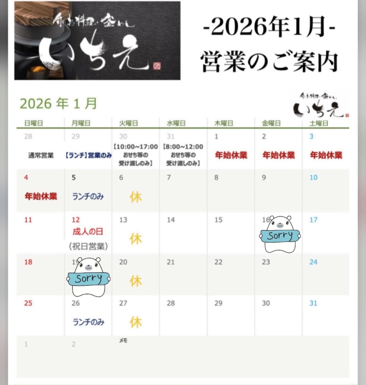 平素より「旬のお料理・釜めし いちえ」をご利用いただきありがとうございます。
