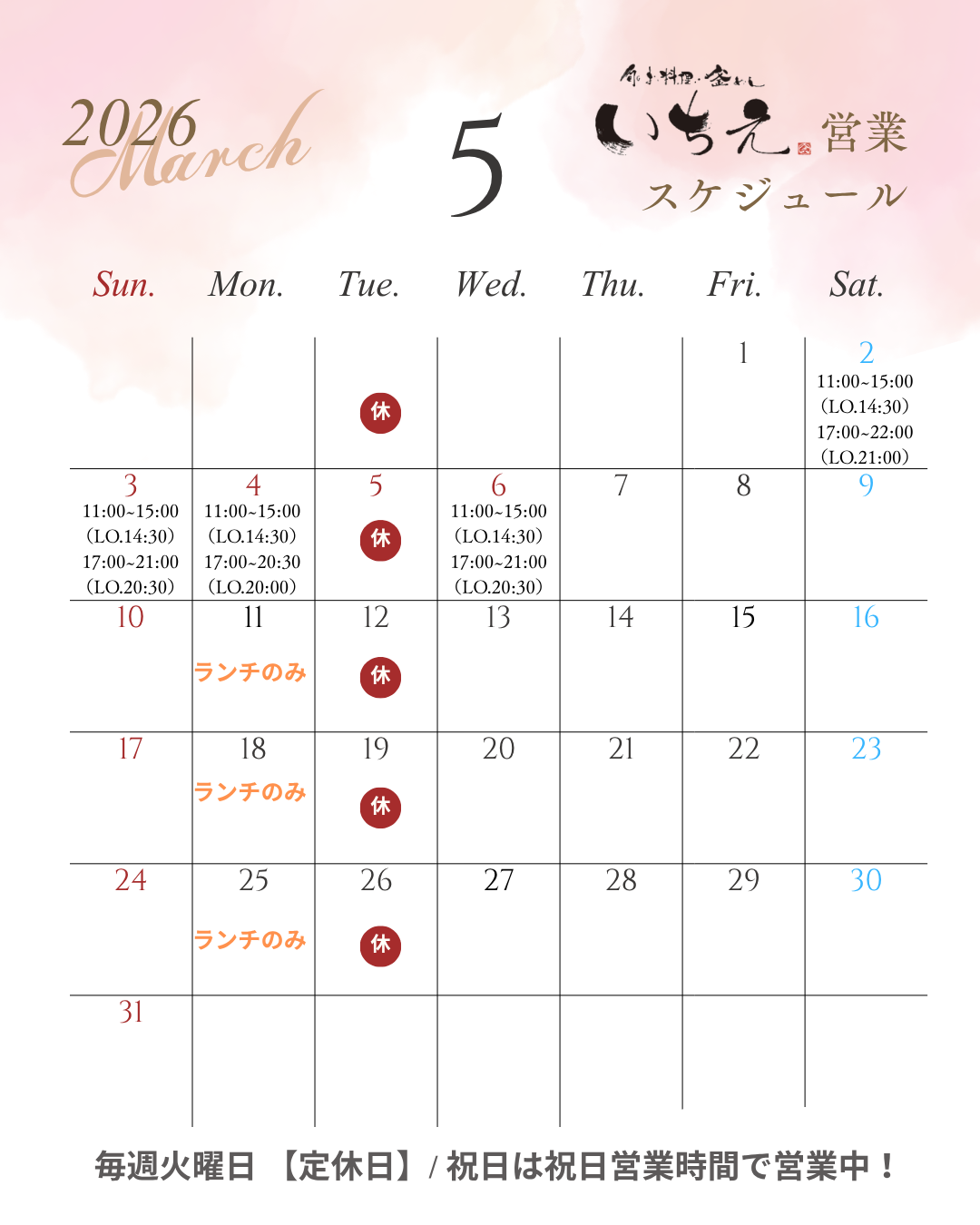 🌟火曜日→定休日
